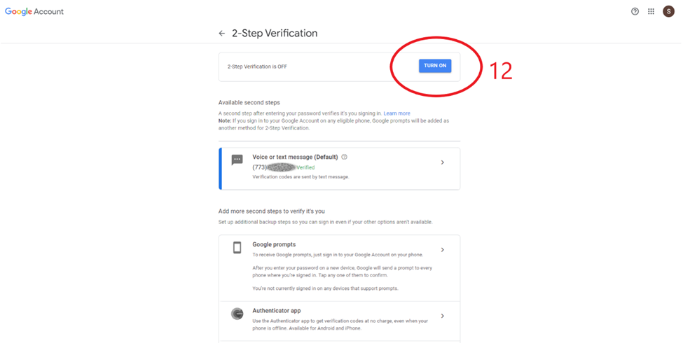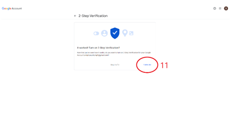 8.Click on TURN ON to finish the process, if 2-Step Verification is not on after, head back to the home page and select the security tab, click on 2-Step Verification, and re-select TURN ON