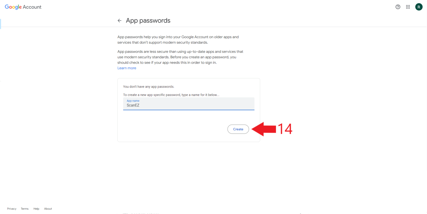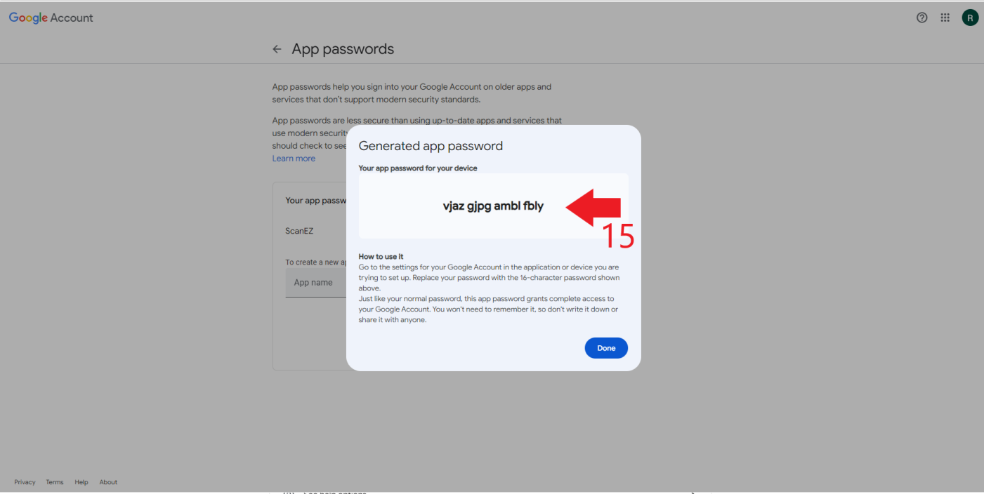 13.This window will provide you with the app password. This code will need to be sent to Today’s Business Solutions for them to enter this new password into the email smtp configurations