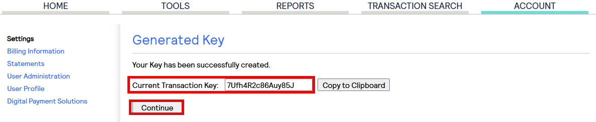 - When the NEW TRANSACTION KEY is created, you will want to copy it somewhere safe. (Note: you must document the information from this screen as they do not show the Transaction key anywhere else after you hit continue for security reasons). If you lose this, another key wil have to be generated by starting this process over.