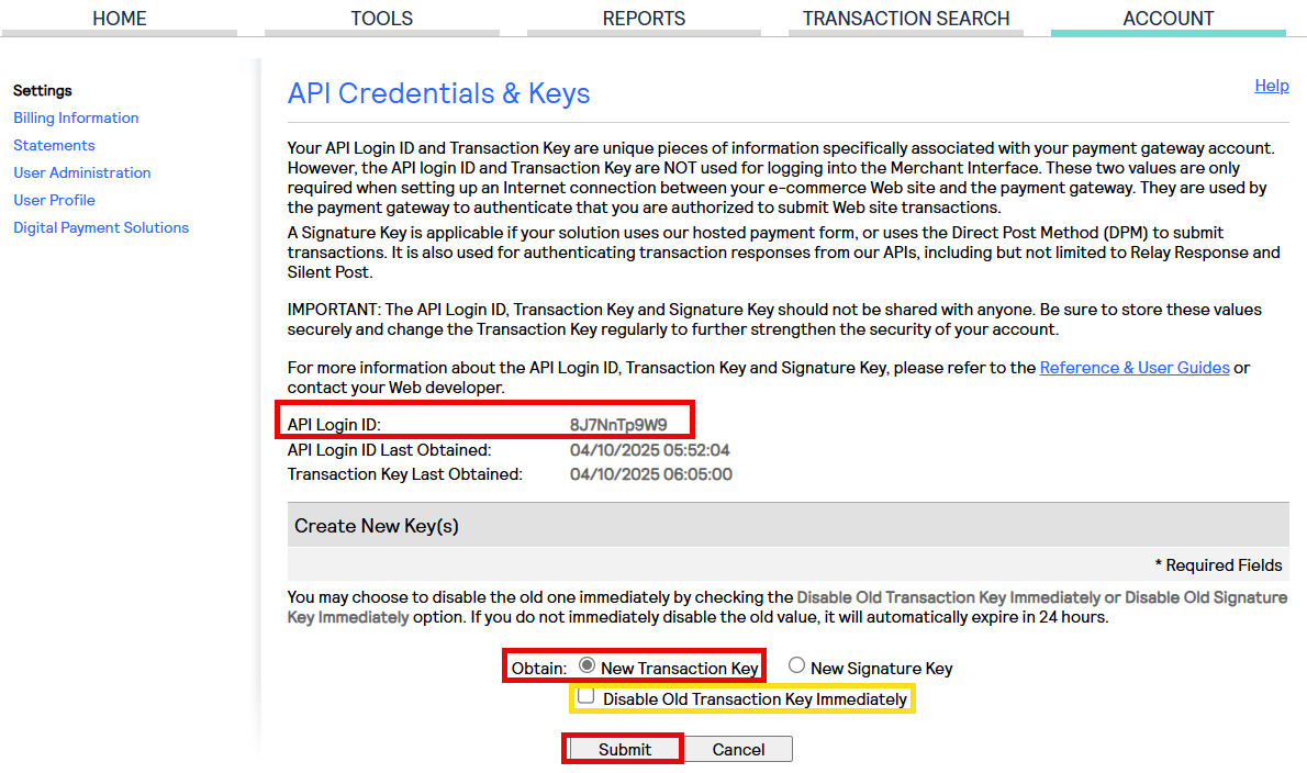 - On the next screen, document your API Login ID as this will be needed. This will always show on this screen so you can always go back and obtain it. Next, select 'Obtain: New Transaction Key’ and hit SUBMIT. If you already have an API Key that was generated, you need to disable Old Transaction Key.