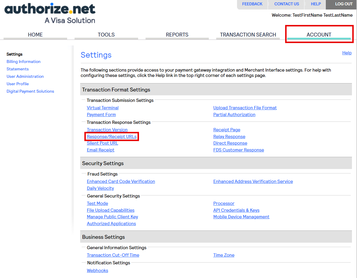 - Click on the ACCOUNT tab and then “Response/Receipt URLs” under the Transaction Format Settings.