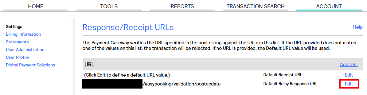 - From here, click EDIT next to the Default Relay Response URL and put in: https://YOUREXTERNALURL/easybooking/validation/postccdata