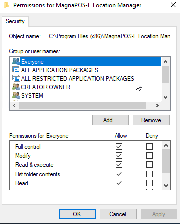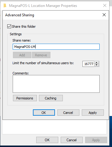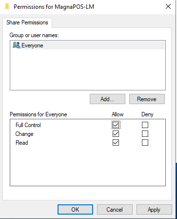 4. Once the software is installed, make sure to share the: “C:\Program Files (x86)\MagnaPOS-L Location Manager” directory. TBS recommends the share name: MagnaPOS-LM. Make sure to give everyone full permission to the Share and Security permission to this folder.