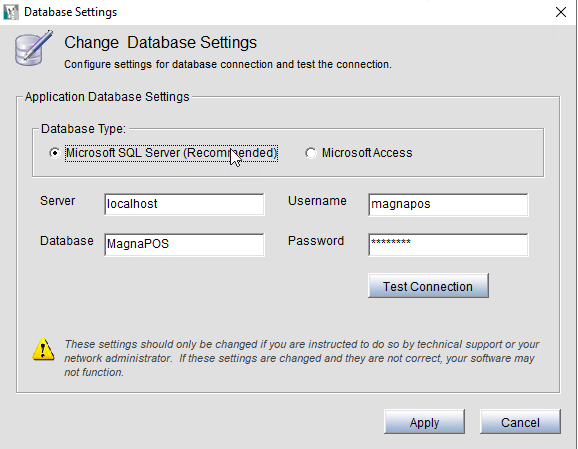 6. Once the sysCO.mdb is in the correct directory and you have the SQL database where you want it, the next step is to point the Location Manager to the existing database. To do this, run: “C:\Program Files (x86)\MagnaPOS-L Location Manager\DBSettings.exe”. *NOTE: make sure to 'RUN AS ADMINISTRATOR'
