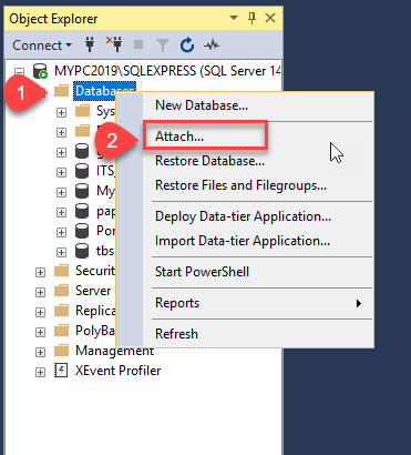 4. Open SQL Management Tools and login. Once you are logged in, Attach the database.