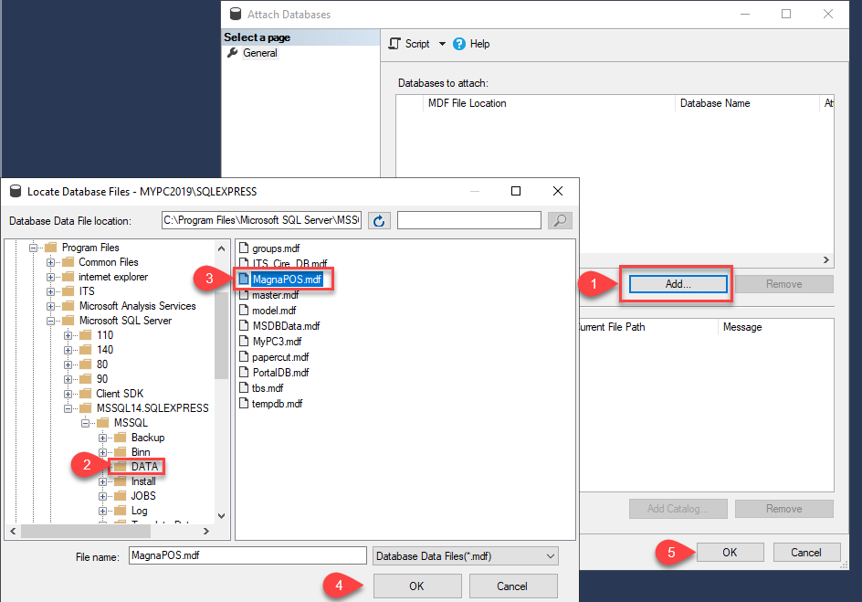 - The ‘MagnaPOS’ database needs to be added to the SQL directory so you can be Attached to the new SQL Server using the Management Tools. DEFAULT: “C:\Program Files\Microsoft SQL Server\MSSQL14.SQLEXPRESS\MSSQL\DATA”
