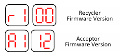 Hold the Mode button on the recycler to enter the menu. When the MODE switch is pressed and held for 2 seconds, the unit will stop displaying the bill count and will display the current mode. The text will flash. Each press of the MODE switch will toggle to the next mode. If a mode is selected and the user takes no further action for 30 seconds, the bill count display mode will be automatically selected.