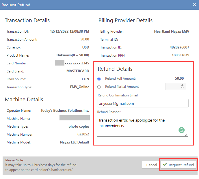 - Once you have completed the request, click on Request Refund. This will email the user that the refund is being processed. It can take up to 4 days to process the refund.