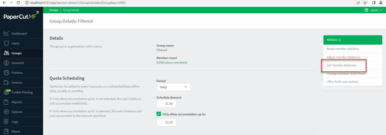 4. When selecting the group, you will be moved to the Group Details page. Here is how we configure the quotas, but in the top-right corner you will see an option "Set Member Balances"