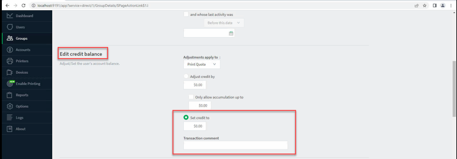 5. This will bring you to Bulk User Operations page and from here, you will notice the page is already populated with your group, but you will need to scroll down and set the credit amount. You can also enter in a comment for reporting reasons. NOTE: If you allow patons to hold cash balances, you want to make sure you make the adjustment to the PRINT QUOTA purse, not cash balance.