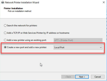 - Choose “Create a new port and add a new printer: LOCAL PORT