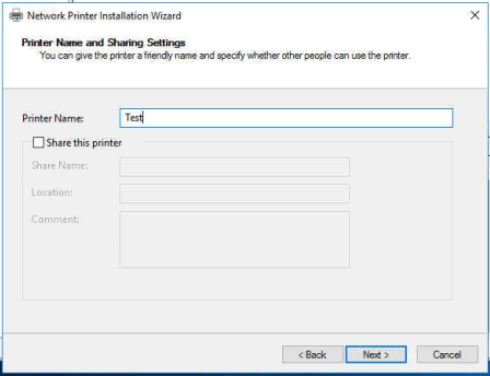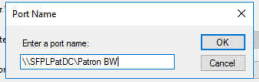 - “Enter a Port Name:” is where you put the share name Path and click OK. For example: “\\servername or IP\Patron BW” or “\\servername or IP\Patron Color”.