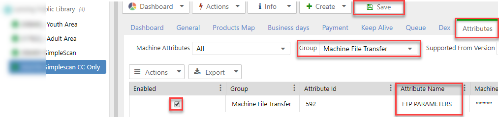 - You will also need to download the logo to the device under Machine File Transfer and add the FTP Download link provided by Nayax on the FTP PARAMETERS field and check the attribute box. DO NOT HIT SAVE YET