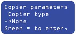 Black Button to enter the MENU > COPIER PARAMATERS > Hit Green Button to enter the menu. Hi Configure Copier Type to be ‘NONE’.