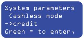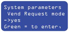 Hit Blue Button to return to MENU > SYSTEM PARAMETERS > Hit Green Button to enter the menu. > Go to ‘Cashless Mode’ and set it to CREDIT if it is not already (default). Hit Black Button > Vend Request Mode Set this to ON.