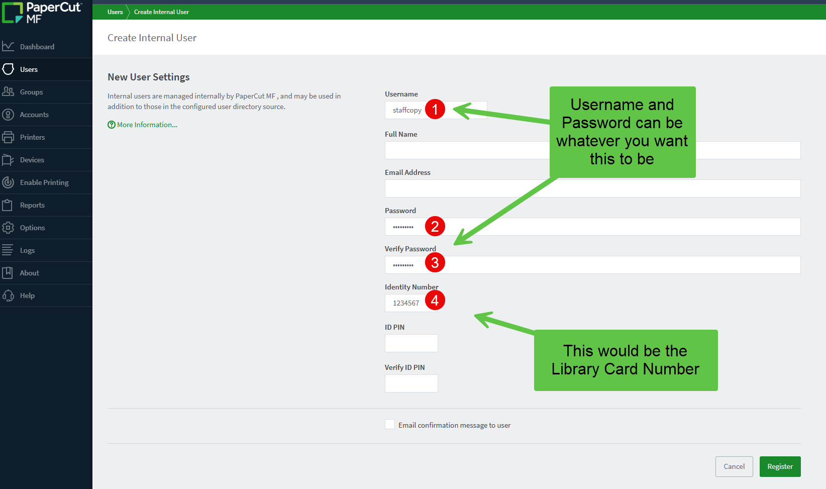 - Identity Number: This would normally be the library card number you are using to set this up