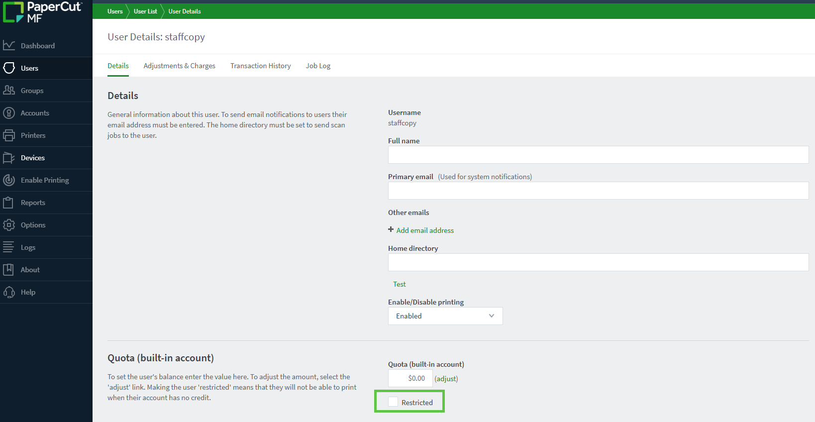 Creating a Staff Override Account for Copying