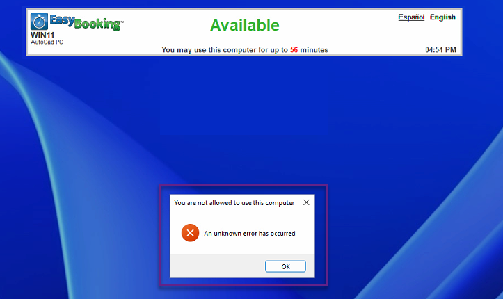 If MyPC shows "Available" on the Status Bar on all Public machines, but you get an error "An Unknown Error has Occurred" for ALL cards including Tech and Staff Users,